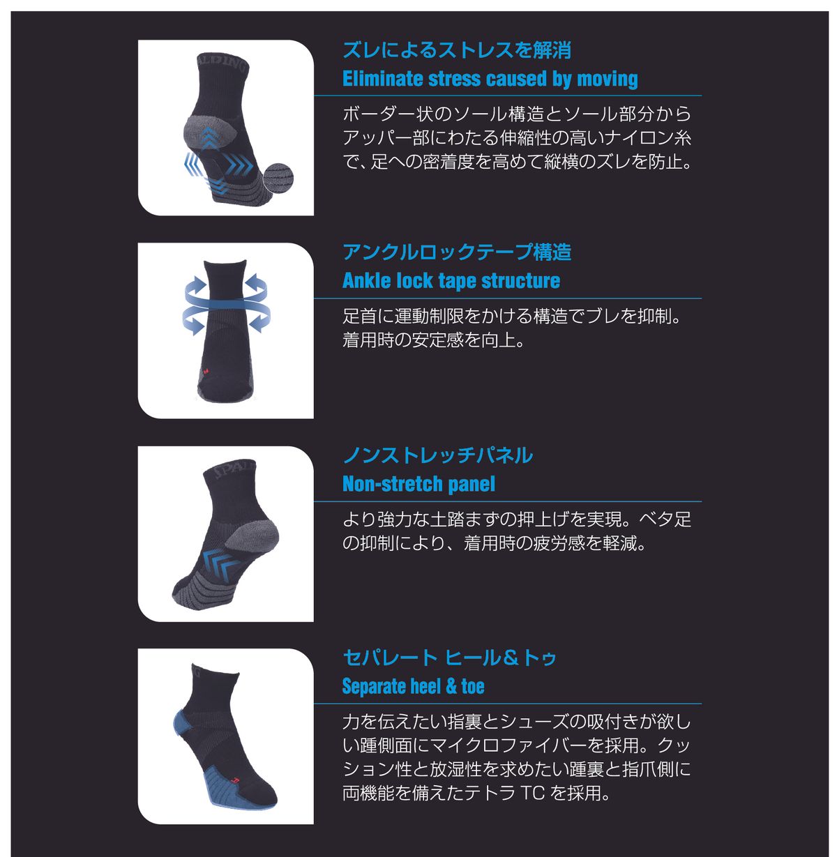 ソール部分からアッパー部分にわたり、伸縮性の高いナイロン糸を使用し、ソックスの外側と内側の両面で足がズレることを防止。吸水速乾に優れた糸を使用し、ムレを感じにくい構造となっている。