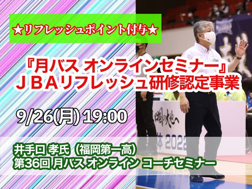 【予告編】JBAリフレッシュ研修認定事業開催! 第36回 月バス オンライン コーチセミナー 井手口 孝氏/福岡第一高)「中学までに身に付けておきたいスキル」と「高校で身に付けるべきスキル」