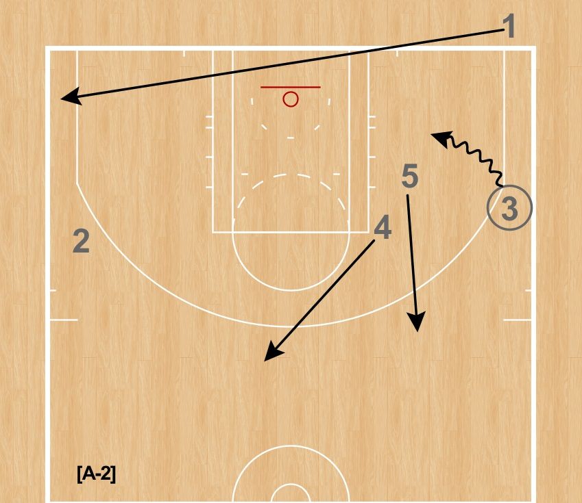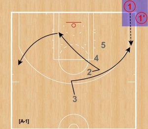[A-1] コーナーからライン状(一直線上)に、インバウンダーの①から⑤・④・②・③が並ぶ形でスタート。 ②はフェイクした後、リング方向へカット。③は⑤と④をスクリーンのように使ってウイングへ飛び出し、ボールをレシーブする。