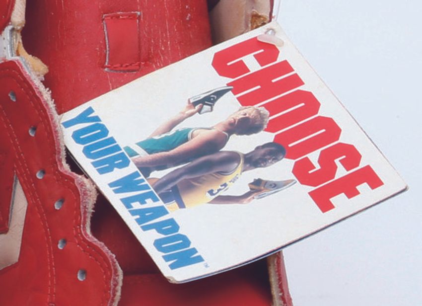 Vol.7 CONVERSE WEAPON コンバース ウェポン 文=岸田 林 (つづき) ここに来てコンバースは、ようやくマーケティング戦略を刷新する必要性に気付かされ、86年、オールスターウイークエンドにあわせ、バードとマジックを起用したキャンペーンCM「CHOOSE YOUR WEAPON」を放送する。そのCMは、故郷インディアナ州で黙々とシュート練習をするバードの下に、黒塗りのリムジンで乗り付けたマジックが陽気に話しかけるところから始まる。 「コンバースは去年のMVP、ラリー・バードのためのシューズを作ったんだってな」と言うマジックに対し、黒の「ウェポン」を履きながら静かに「そうだ」とうなずくバード。それを受けて、マジックはウォームアップを脱ぎ捨てながら「今年のMVP、マジックのシューズも作ったみたいだぜ!」と言い放ち、その足元には、レイカーズカラーの「ウェポン」が…。 マジックの自伝「MY LIFE」(ウィリアム・ノヴァクとの共著)によれば、数日間に及んだこのCM撮影がきっかけで2人は言葉を交わすようになり、互いを明確に意識するようになったという。そして2人のキャラクターやライバル関係を活かしたこのCMは大きな反響を呼び、コンバースに新たなブランドイメージを吹き込むこととなる。 バードは当時、2年連続MVPを獲得するなどキャリアの絶頂期。この年のプレイオフ1回戦で、バード率いるセルティックスはブルズと激突。のちに「マイケル・ジョーダンの姿をした神だった」というバードのコメントで知られることとなる第2戦(ケガから復帰直後のジョーダンがプレイオフ史上最多の63得点)でも、バードは黒の「ウェポン」を履いてジョーダンを迎え撃ち、しっかり勝利をもぎ取っている。一方のマジックも“ショータイムバスケット”で人気を集めたレイカーズの中心選手として、すでに3度の優勝を経験。これに対してジョーダンはまだプロ入り2年目で、優勝はおろか、チームとしての実力を証明できていなかった。コンバースはそこに勝機を見出したのである。 翌87年にはバード、マジック、アイザイア・トーマス(元ピストンズ)、ケビン・マクヘイル(元セルティックス)、マーク・アグワイア(元マーベリックスほか)、バーナード・キング(元ニックスほか)といったオールスター級の選手たちがそろって「ウェポン」を片手にラップを披露するCMも放送。最後にはやはりバードがMVPトロフィーを見せ付け、コンバースが“実力のあるアスリート”に愛されるブランドであることを訴求。こうして「ウェポン」は、世界で400万足を売り上げる大ヒットとなった。 現在ナイキの傘下にあるコンバースは、この時代、間違いなくNBAとバッシュをリードするブランドの1つだった。2009年にドウェイン・ウェイド(ブルズ)が離脱してからというもの、NBAのコートでコンバースを着用する選手を見かけることは少なくなってしまったが、バスケと共に歩んできたブランドが、再びNBAのコートに舞い戻る日は来るのだろうか。 (おわり) 写真=中川和泉 (月刊バスケットボール2017年7月号掲載)