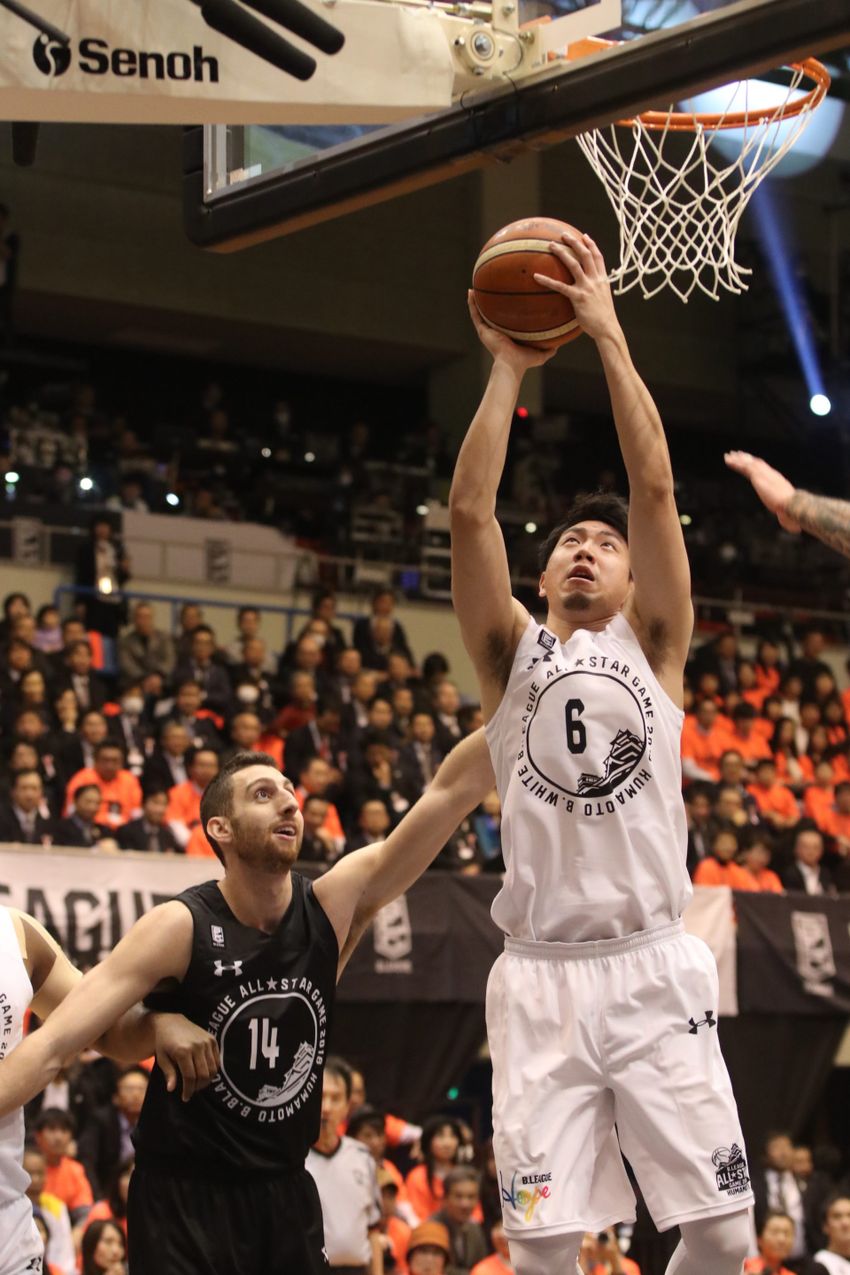 ダンクを失敗するなど、らしからぬプレーだったB.WHITE#6比江島 今回熊本で開催された理由は、一昨年起きた熊本地震の被災地復興のため。加えて、昨年7月の九州北部豪雨の復興も兼ねて、試合前日の13日にB.WHITEとB.BLACKの2つのチームが、Bリーグの慈善活動B.HOPEの一貫でそれぞれの被災地を訪問した。 そして迎えた本戦、選手たちはこの日会場に集った3242人を沸かせるプレーを連発した。B.BLACK#00サクレ(SR渋谷)、B.WHITE㉝ブラウン(琉球)のダンクの応酬や、元チームメイトのB.BLACK#0田臥(栃木)から#27熊谷(大阪)のアリウープ、そして高確率の3Pシュートと熊本のファンを唸らせる。さらには地元出身で、先頭に立って熊本の復興支援に携わってきたB.BLACK#7小林(熊本)の連続3Pシュートで会場のボルテージは最高潮に。そして終盤はシーズンさながらの真剣な表情で激しい攻防となったが、#51古川(琉球)の連続3PシュートなどでB.WHITEが123‐111で勝利した。 試合後には各賞が発表され、SNSのファン投票で選ばれたMVPには、この試合18得点を挙げゲーム以外での貢献度も込めてB.BLACK#7小林が受賞、会場を盛り上げた選手に送られる熊本県モンVPにはB.BLACK#1川村(横浜)が選出された。