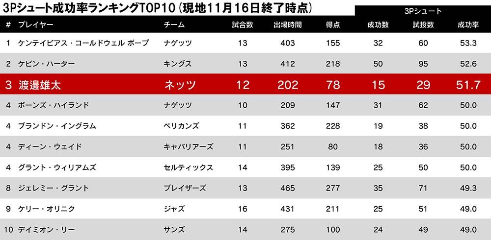 渡邊雄太3Pショット2本成功11得点、12試合経過して3P成功率リーグ3位