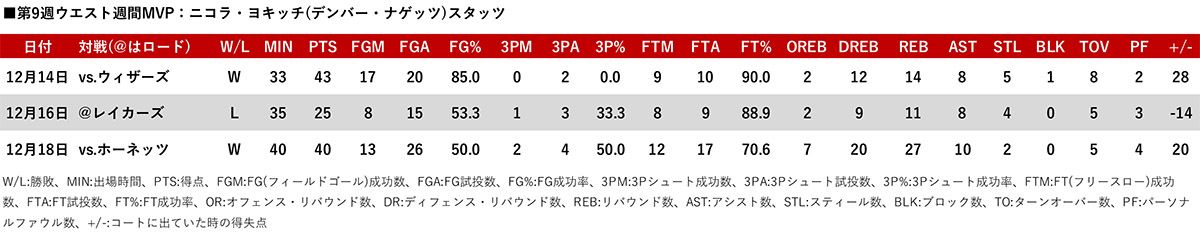 現地12月19日(日本時間20日)、NBAは第9週(12月12日〜18日)のプレイヤー・オブ・ザ・ウイーク(週間MVP)を発表。イーストからはドノバン・ミッチェル(クリーブランド・キャバリアーズ)が、ウエストからはニコラ・ヨキッチ(デンバー・ナゲッツ)が選出された。
