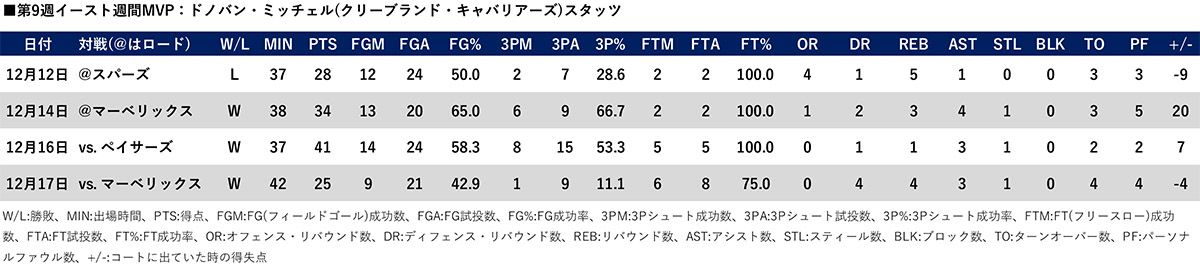 ミッチェルは、前週4試合で平均32.0得点、3.3リバウンド、2.8アシストをマーク。中でも12月16日のペイサーズ戦では41得点と今季2度目の40点オーバーを記録した。そしてチームはイースト3位20勝11敗)という好位置に付けている。