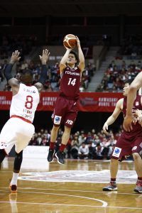 Bリーグは前節で30試合を終え、ちょうどシーズンの半分を消化。ここまでを振り返り、シーズン前から予想されたとおり、東地区のレベルが非常に高い。 栃木がホームで滋賀に連勝したことで、6クラブ全てが勝率5割以上に。この栃木は東地区最下位とはいえ、昨シーズンの王者が浮上してきたことで、地区の上位2クラブと、これを除く勝率上位2クラブに与えられるチャンピオンシップの出場権争いはさらに激化しそうだ。 その東地区で2、3位の千葉と川崎が1月26、27日に激突。結果的には、星を分け合った両クラブだが26日の試合では序盤に川崎がファストブレイクで千葉を圧倒した。 試合前に「オフェンスをいい形で終えることが相手を走らせない1つの大きな要素になると思う」と篠山はコメントしていたが、その言葉どおり、#14辻、#22ファジーカスの得点源がきっちりシュートを沈める。さらに注目すべきは、1Qのターンオーバーが0な上、ファストブレイクポイントが11だということ。#0藤井は「よくボールが回っていました」と振り返り、#7篠山も「ボールラインを下げることで全員がノーマークを作り出せました」と流れの良いオフェンスの要因を挙げる。その結果、「想定外だった」(北ヘッドコーチ)という28得点で絶好のスタートを切る。 その後も持ち味のディフェンスが機能し、「相手にセカンドチャンスを与えないことは口を酸っぱくして言ってきました」という北ヘッドコーチの指示がうまく浸透した時間帯が多かった。