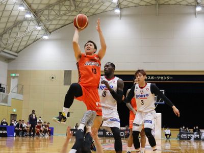 2月5日に行われた愛媛オレンジバイキングスのホームゲームより(写真はゴールに向かう#13俊野佳彦[背後はバンビシャス奈良#19ジェレマイア・ウィルソンと#3藤高宗一郎]/©B.LEAGUE)