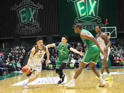 B3上位同士の激突となった2月3日の横浜エクセレンス対岩手ビッグブルズより。岩手は現時点でホーム勝率がリーグトップだ(写真は#7クリスチャン・ドゥーリトルとのピックプレーから#33俊野達彦と#40ジョーダン・フェイゾンに対しドライブを仕掛ける門馬圭二郎)