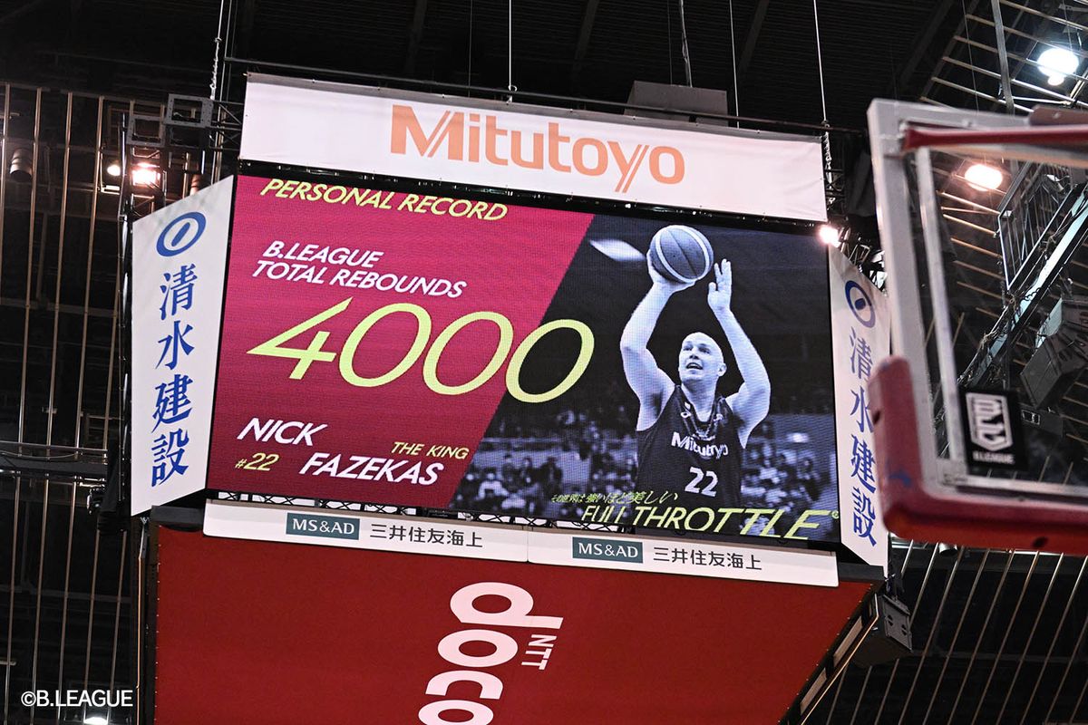 この試合で#22ファジーカスは、B1史上初の通算4,000リバウンドを達成