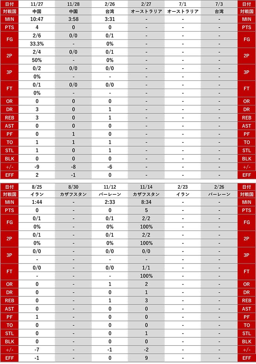 2019年 新人賞ベストファイブ■FIBAバスケットボールワールドカップ2023 アジア地区予選STATS