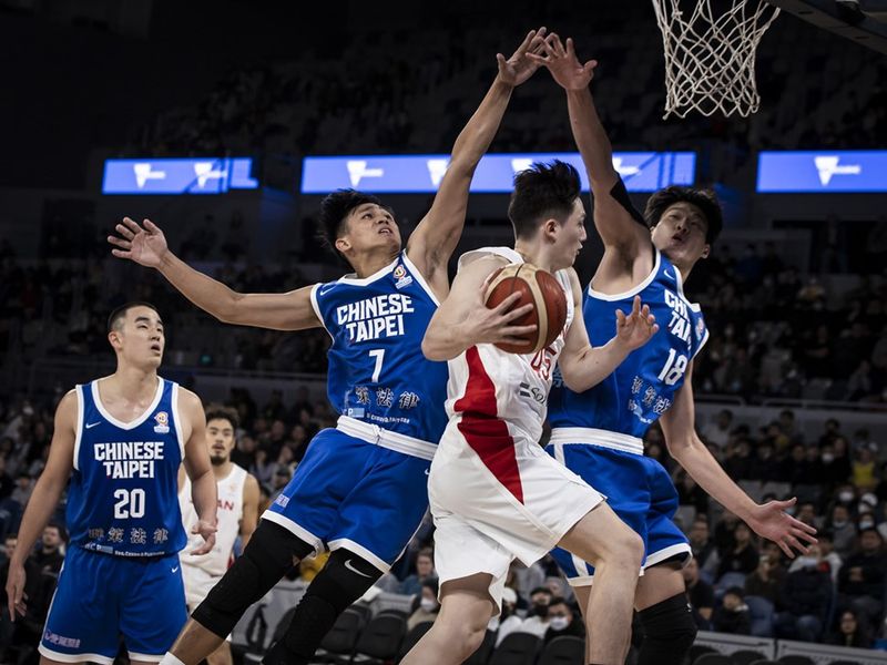 FIBAワールドカップ2023アジア地区予選の日本戦でテーブス海のドライブをブロックに行く#7ユー・アイジェ(写真/©FIBA.WC2023)