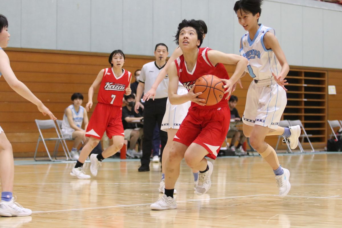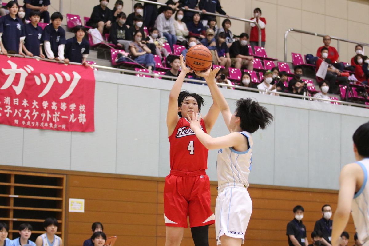 後半は一転、点の取り合いとなるが土浦日本大が差を詰めようとするたびに千葉経済大附も確実に返し、前半の点差が最後まで詰まらず。特に千葉経済大附#5坂口(ゲームハイ26得点)が後半にステップアップ。前半から要所で得点はしていたが、後半は土浦日本大のオフェンスにリズムができかけるたびに持ち味の力強いドライブでその流れを絶っていった。「ずっとドライブが自分の武器だと思っているのですが、(決勝の後半でも)一度良いドライブが決まったときに今が攻め時だなと思って、思い切ってチャレンジしました。思ったより通用したと思います」と#5坂口。