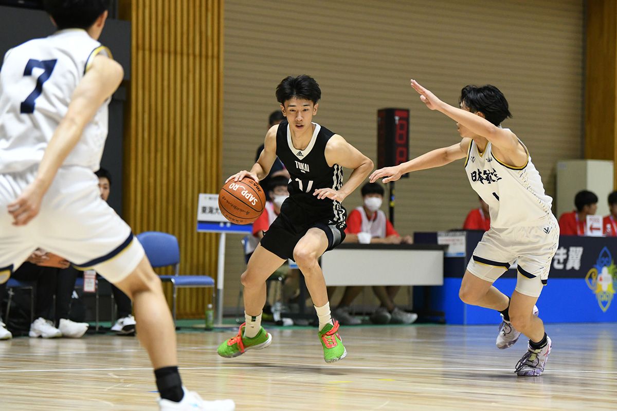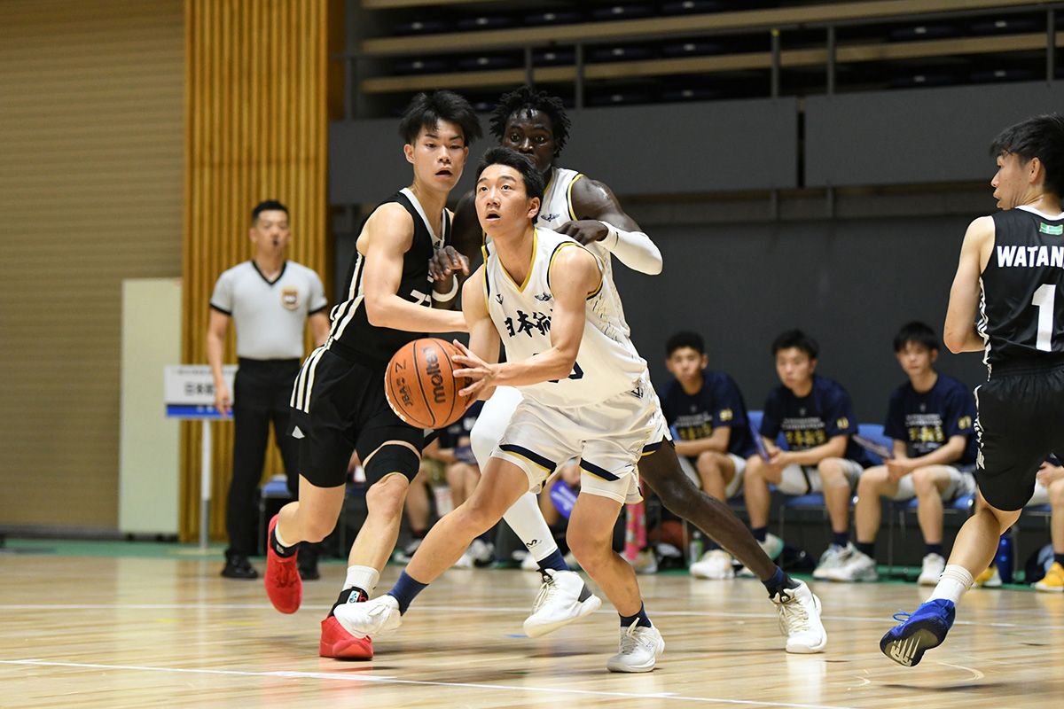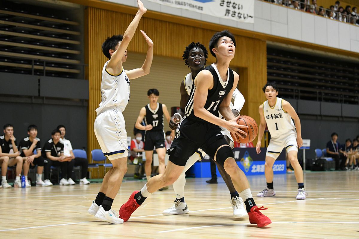7月26日、北海道インターハイ2023大会2日目男子2回戦で関東大会王者の日本航空(山梨県)と昨年のウインターカップ8強の東海大付諏訪(長野県)が対戦。終始拮抗した展開となったが、#23オルワペルミ・ジェラマイアのインサイドを支配した日本航空が75-69で勝利。ベスト16進出を決めた。