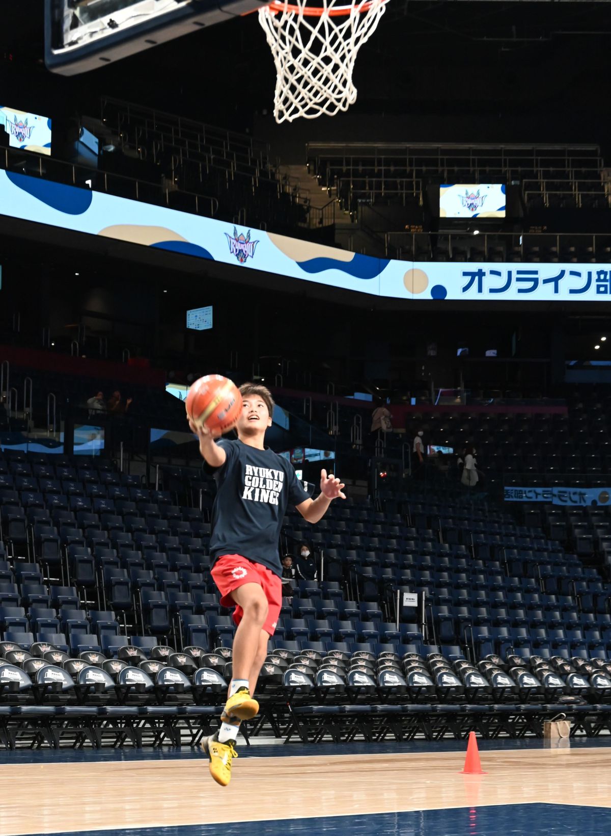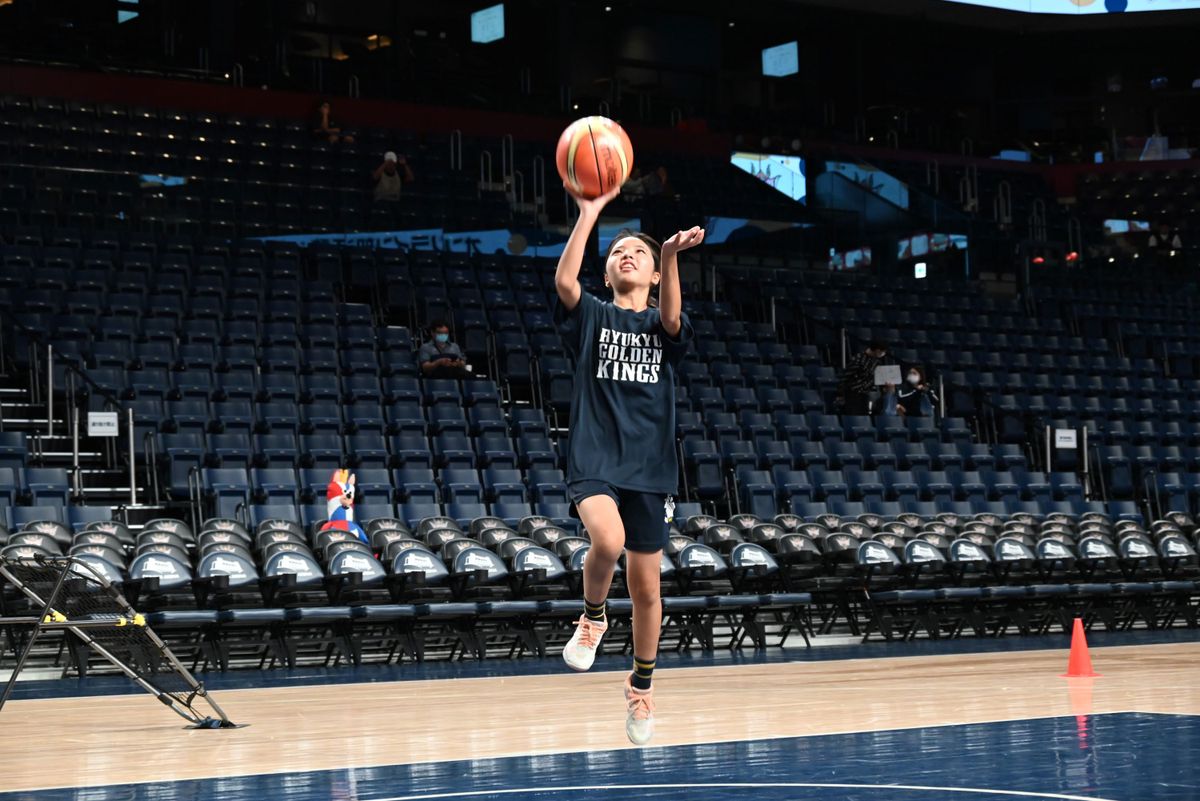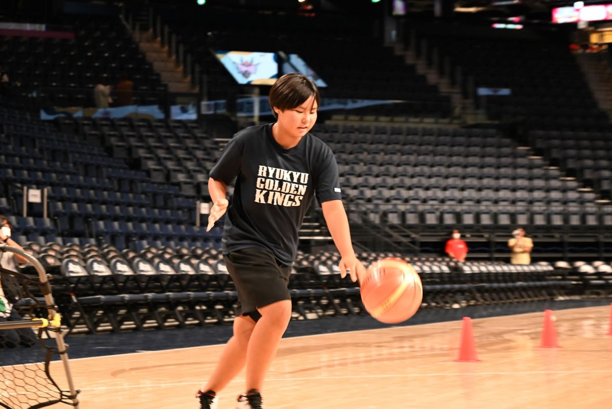 そうして迎えた今回、沖縄アリーナで行われる琉球ゴールデンキングスのホームゲーム(対富山グラウジーズ)の前に、渡嘉敷中の生徒9人が、オンラインバスケ部で学んだ技術を披露するため「スキルズチャレンジ」に臨んだ。学校の体育館とは異なるフロアの広さや高い天井、きらびやかな照明などにはじめのうちは圧倒されながらも、いざチャレンジが始まると、生徒たちは制限時間内にドリブルやパス、シュートなど決められた課題を次々とクリアしてゆき、練習の成果をみごとに発揮。何より、部活に励み、その成果を示す場があることの喜びを満面の笑顔が証明していた。