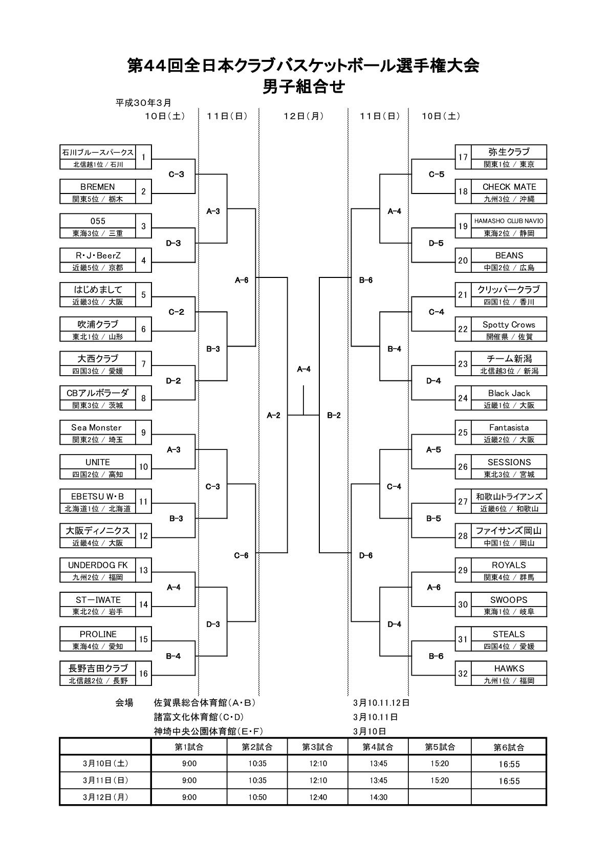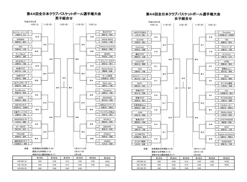 3月10~12日に佐賀県総合体育館ほかで開催される第44回全日本クラブバスケットボール選手権大会の組み合わせが発表された。各ブロック予選を勝ち抜いた男女32チーム、全64チームが出場して日本一を競う。   来年度からカテゴリー再編のため、“クラブ”カテゴリーとして最後の全国大会となる。   組み合わせは以下のとおり。   【男子】