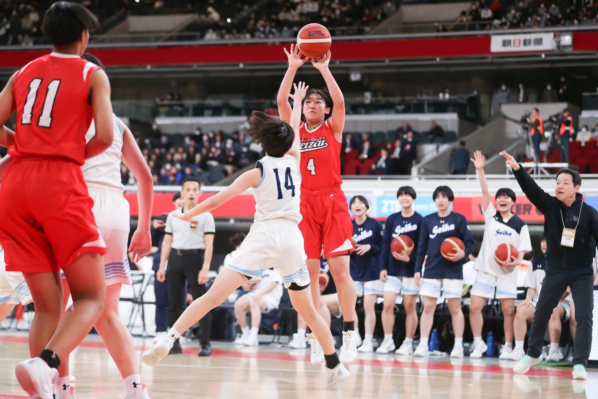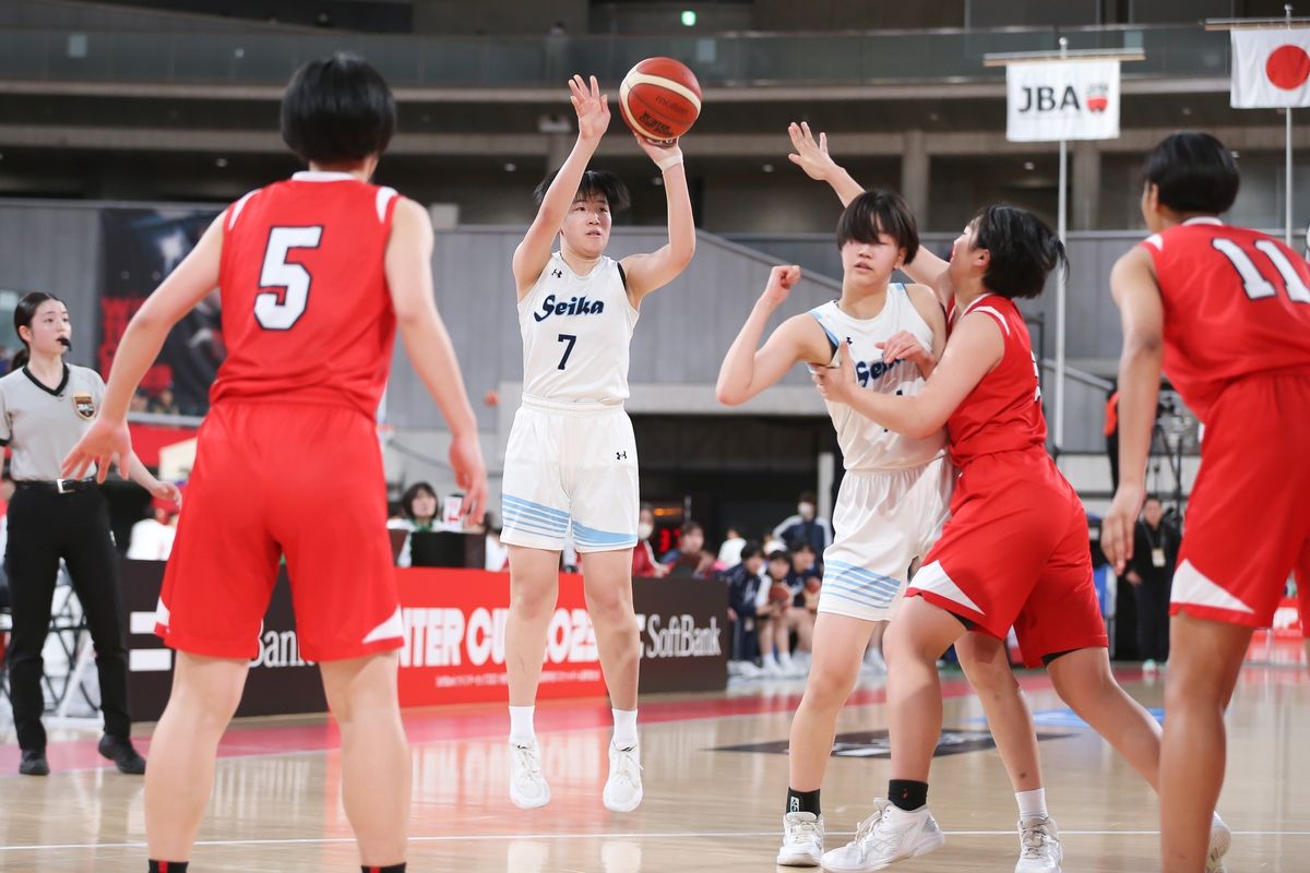 千葉経済大附は2ポイントのシュート成功率で精華女(32.1%)を上回る48.4%をマーク。#4角が19得点、#5坂口が18得点(25リバウンド)、#10田端が16得点、#7牧野が13得点と5人が2桁得点を記録した。一方、精華女は#7清藤が3Pシュート5本を決めて両チームトップの26得点、さらに#4谷が19得点をマークしている。