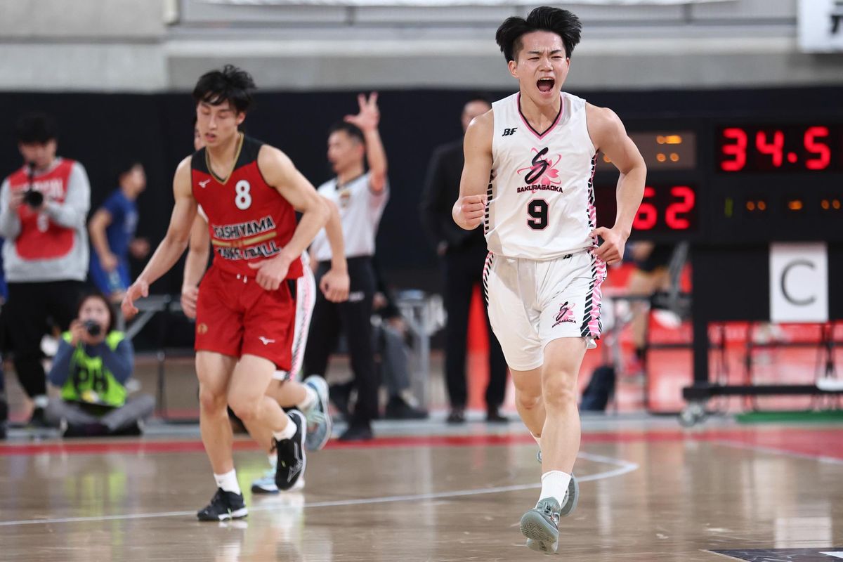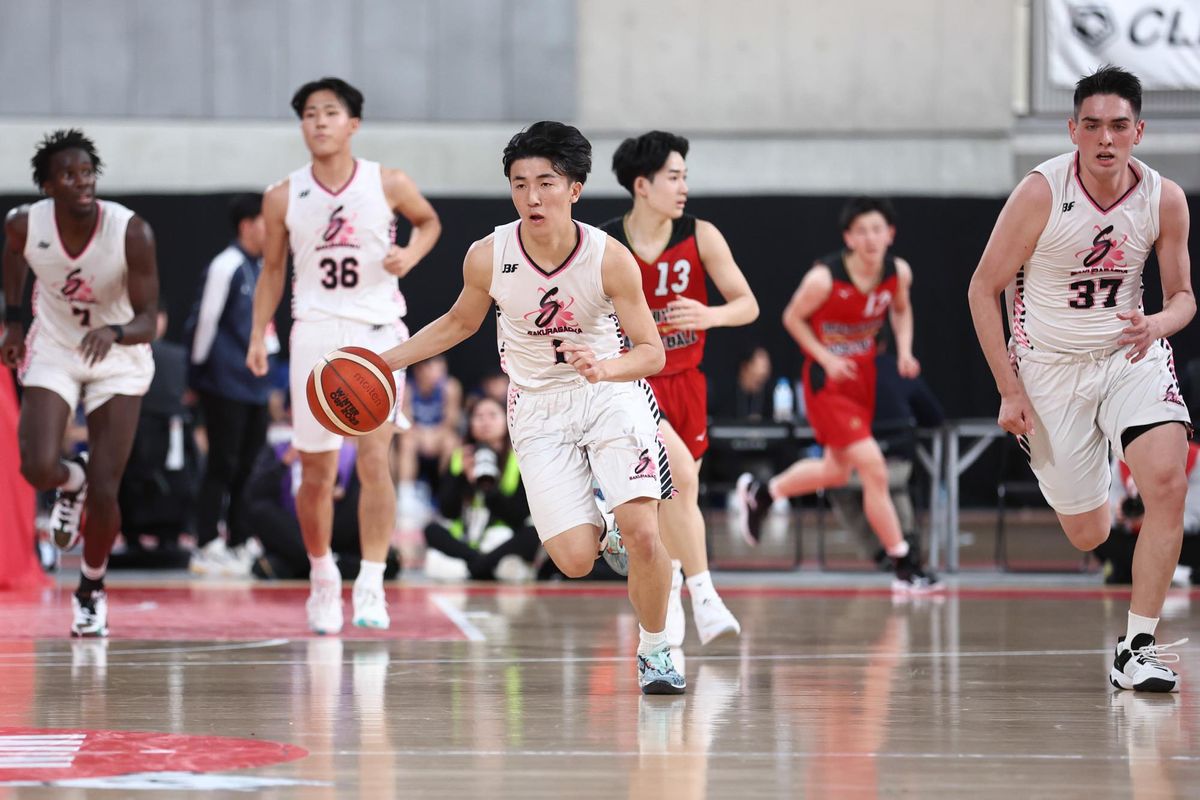 抜群のドリブルワークが持ち味の#1舘山洸騎をエースに据え、安定感と爆発力のあるコンボガードの#9平寿哉、ディフェンスや3Pなどの裏方として輝く#36橋本岳大、インサイドの要の1人#37服部フェルナンド、そして守護神#7セイ・パプ・マムウルという不動のスターティング5を形成。加えて、控えガードの#32 松井快吏らも思い切りよくプレーし、東山を追い詰めていった。