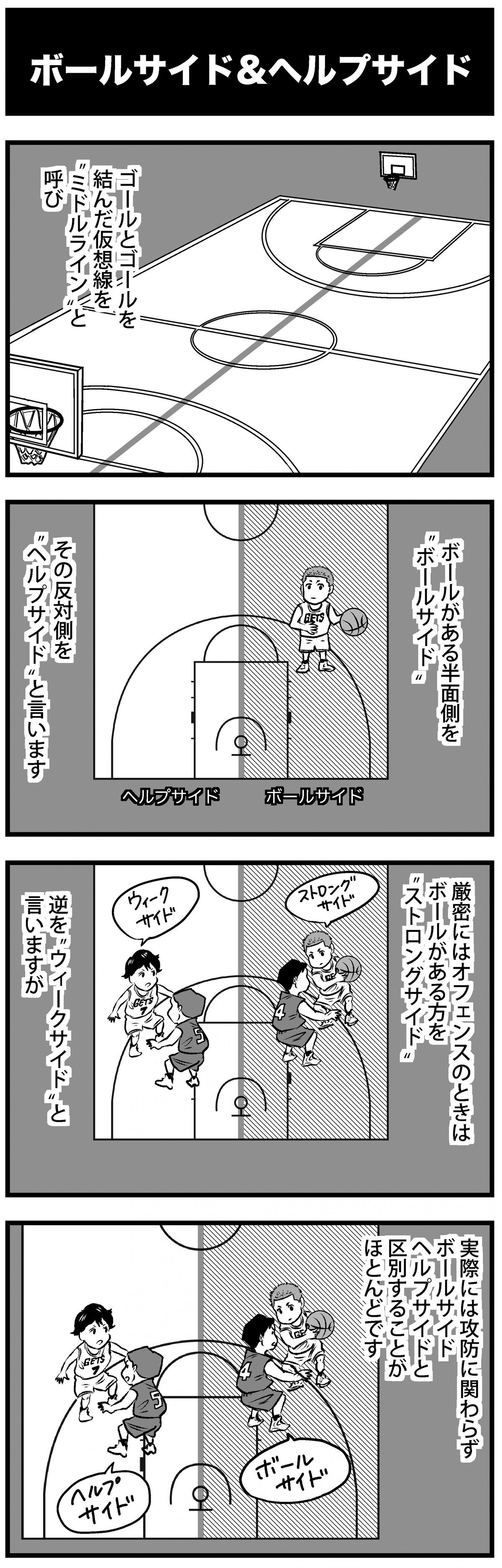月刊バスケットボールで連載中の『まんが バスケットボール用語辞典』をウェブでも読めるように! 和製英語ではなく、正しい英語のニュアンスで理解していくと、より分かりやすくなる。今週は“ボールサイド”と“ヘルプサイド”について。 解説=倉石 平 漫画=西村友宏 ★ボールサイド[ball side]…リングとリングを結んだ線(=ミドルライン、仮想)でハーフコートを二分し、ボールのあるサイドを指す。 ★ヘルプサイド[help side]…=ウィークサイド ★ウィークサイド[weak side]…ミドルラインでハーフコートを二分し、ボールのないサイドを指す。 (月刊バスケットボール) ※2016年2月号より連載中(2017年6月号別冊付録分)より抜粋