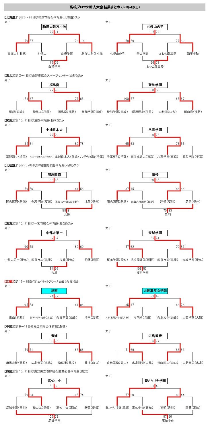 これまでに1月末から行われている各ブロック(北海道、東北、北信越、東海、近畿、中国、四国)の“高校新人大会”の結果(ベスト4以上の勝ち上がり表)をまとめた。 また、各ブロックの優勝は以下のとおり。 【北海道】男子…駒沢大附苫小牧、女子…札幌山の手 【東北】男子…福島南、女子…聖和学園 【関東】男子…土浦日本大、女子…八雲学園 【北信越】男子…開志国際、女子…津幡 【東海】男子…中部大第一、女子…安城学園 【近畿】男子…洛南、女子…大阪薫英女学院 【中国】男子…豊浦、女子…広島観音 【四国】男子…高知中央、女子…聖カタリナ学園 昨日まで行われた近畿ブロックの男子は、洛南(京都)が東山(京都)に1点差で辛勝。女子は大阪薫英女学院(大阪)がウインターカップ覇者の大阪桐蔭(大阪)を破ってそれぞれ優勝している。 これで未開催は九州ブロックのみとなった。 【九州】3月17~18日@豊見城市民体育館(沖縄)ほか (月刊バスケットボール)