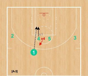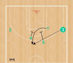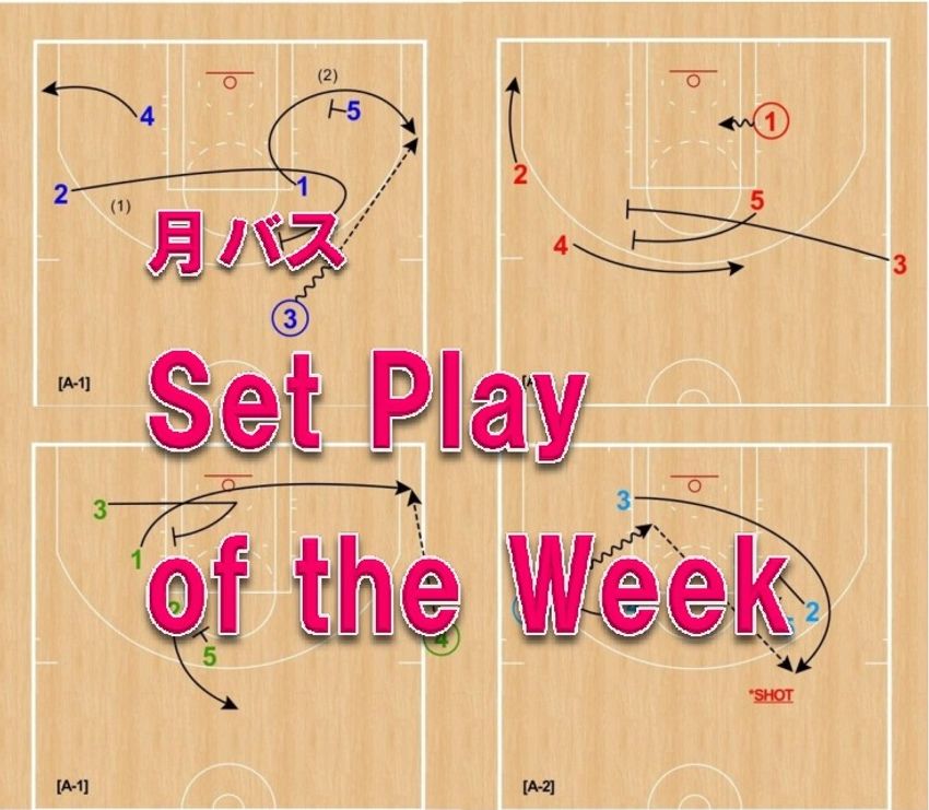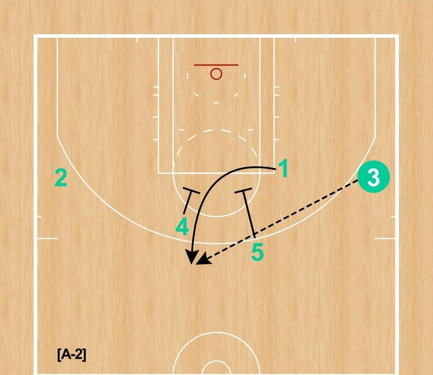 [A-2] カットした①が④と⑤のダブルスクリーン(エレベータースクリーンのような形)を使って、トップへ。③からパスをレシーブする。ワイドオープンであれば、3Pシュートを放っていたはずだ。