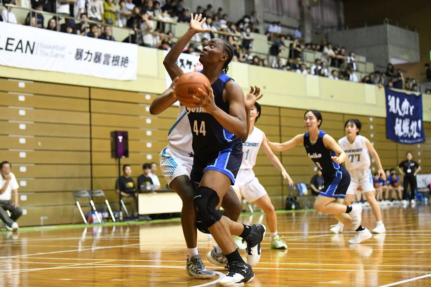 決勝は、精華女と慶誠の顔合わせに。2月の九州新人準決勝では慶誠に敗れた精華女だったが、この日は序盤から試合の主導権を握る。インサイドの#44アギンダーレ・タイウォ・イダヤットだけでなく、アウトサイドシュートも高確率で成功。前半を終えて42-24と、大量リードを奪った。