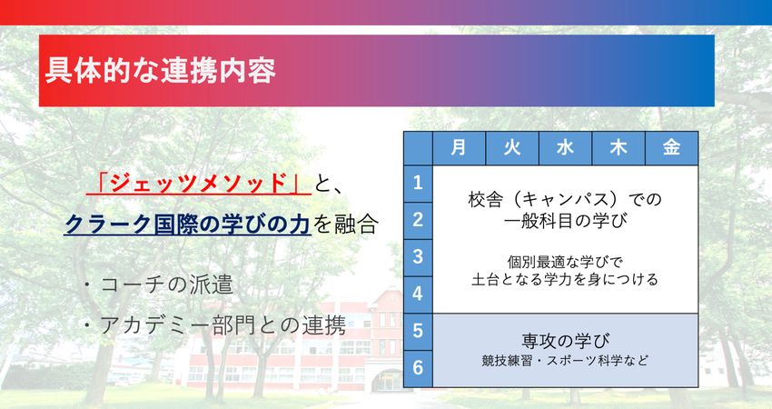 この連携は、これまでも地域と密着した教育を推進してきたクラーク国際と、地域貢献活動に熱心な千葉ジェッツの理念が合致したことで実現した。千葉ジェッツが持つプレーヤーの主体的な学びを促す育成哲学「ジェッツメソッド」と、クラーク国際が有する教育の力を融合させ、競技面だけでなく人間性にも優れた「人として強いアスリート」の育成を目指すという。