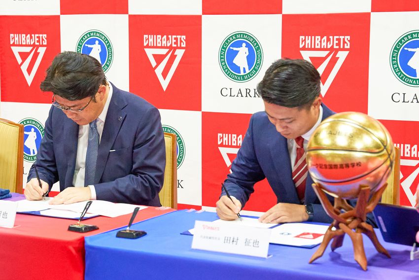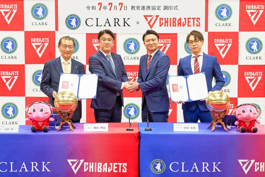 2025年7月7日にIPU・環太平洋大学 東京キャンパスで開かれた調印式には、千葉ジェッツから田村征也代表取締役社長と池内勇太取締役、クラーク記念国際高からは増田理事長と吉田洋一校長が出席した。