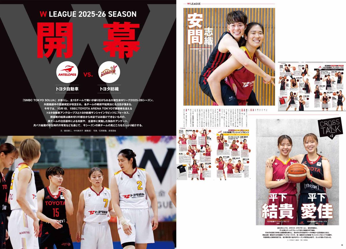 「SMBC TOKYO SOLUA」が参入し、全15チームで戦いが繰り広げられる大樹生命Wリーグ2025-26シーズン。外国籍選手の登録規定が改定され、各チームの戦術や起用法にも注目が集まる。今号では、10月18、19日にTOYOTA ARENA TOKYOで開幕戦を迎えるトヨタ自動車アンテロープスとトヨタ紡織サンシャインラビッツにフォーカス。開幕戦の結果は締め切りの都合から本誌ではお届けできないものの、両チームの注目選手による対談や、全選手に実施した独自のアンケート、月バス秘蔵の学生時代の写真などを通じて、今シーズンの両チームの見どころをたっぷり紹介する。