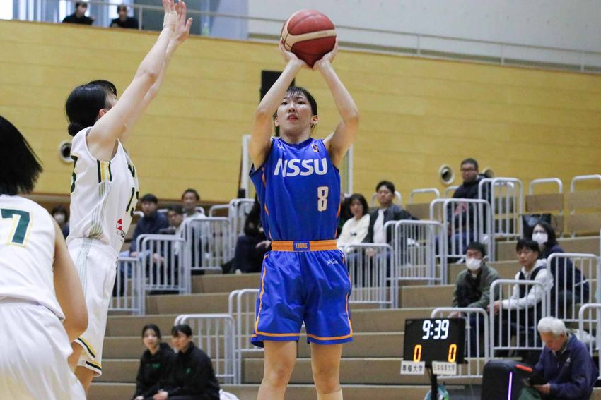 第75回関東大学女子リーグの最終週となった10月25日、日本体育大のキャプテン#8宮城楽子(4年/168cm・F)はさすがの存在感を見せつけた。試合開始15秒、#2永田姫舞(4年/156cm・G)のパスを左ウイングで受けるとクロスオーバーで3Pラインの内側に入ってプルアップジャンパー。これでチーム初得点を奪うと、その後もコンスタントに決め、3Pシュート5本成功で21得点。専修大を78-66で退けて、チームを今リーグ5勝目へと導いた。