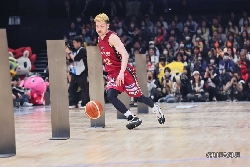 スタート前、比江島慎(宇都宮)にグリーンのコンバースバッシュについていじられていた富樫勇樹(千葉J)は、「切り返しに特化したバッシュです!」とはっきり答えると「20秒前半」を目標タイムと宣言。有言実行のノーミスで21.8秒を叩き出して1位となった。