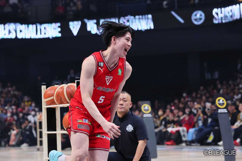 4人目、岡田大河(川崎)は、なんとスペイン語であいさつ。その後、「しっかり見せたい」と語り、20秒前半を目指すと語った。フリースローで2本、2つ目のパスで2本を用意したが最後の3Pシュートを一発で決めて26.9秒を叩き出し、暫定1位となった。