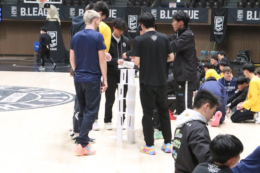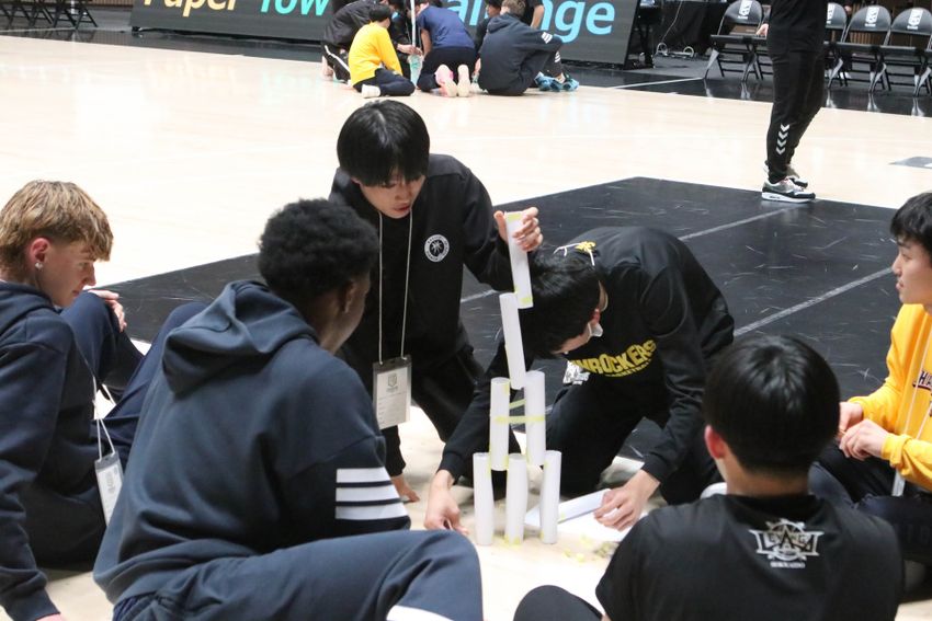続いてはペーパータワーコンテストを実施。コピー用紙とテープを用いて、制限時間の中でいかに高いタワーを作れるかを競うものだが、各チームの個性が出た時間となった。柱となる円柱を立てた上に紙を乗せるという建築技法のような手法を使うチームがあれば、細く硬く巻いた棒を縦につなぐチーム、テープを駆使して半ば強引に積み上げようとするチームなど思い思いの考えで試みていた。中にはタイムリミットに合わせて完成させたものの、計測中に力作のタワーが倒れてしまい、頭を抱えるというシーンもあった。