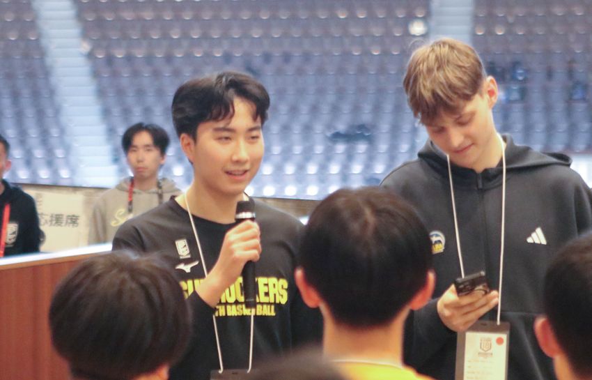 しかし、楽しい時間はあっという間に過ぎるもの。歓談タイムの最後はALBA Berlin U18の#14アントン・ケマーが前に出ると、サンロッカーズ渋谷 U18#34寺澤陸が通訳となって感謝の言葉が贈られた。