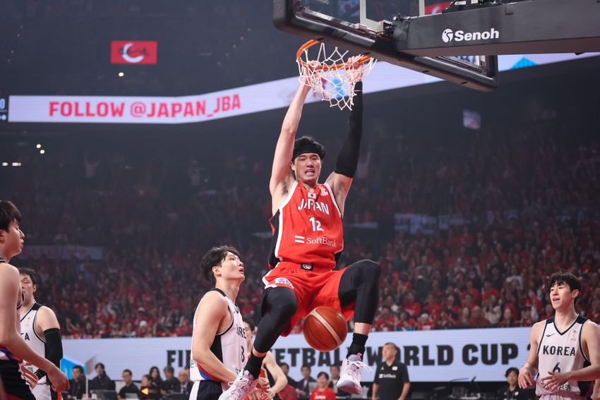 試合は中国戦と同じく#12渡邊雄太のダンクからスタートした。#24 ジョシュ・ホーキンソンがディフェンスリバウンドを奪って#1 齋藤拓実に託すと速い展開からペイントエリアに侵入。ディフェンスが寄るタイミングで、ペイントに侵入した#18 馬場雄大に合わせると、さらにベースラインに沿ってカッティングしてきた#12 渡邊がボールを受けてダンクという人もボールも動くというきれいな得点だった。