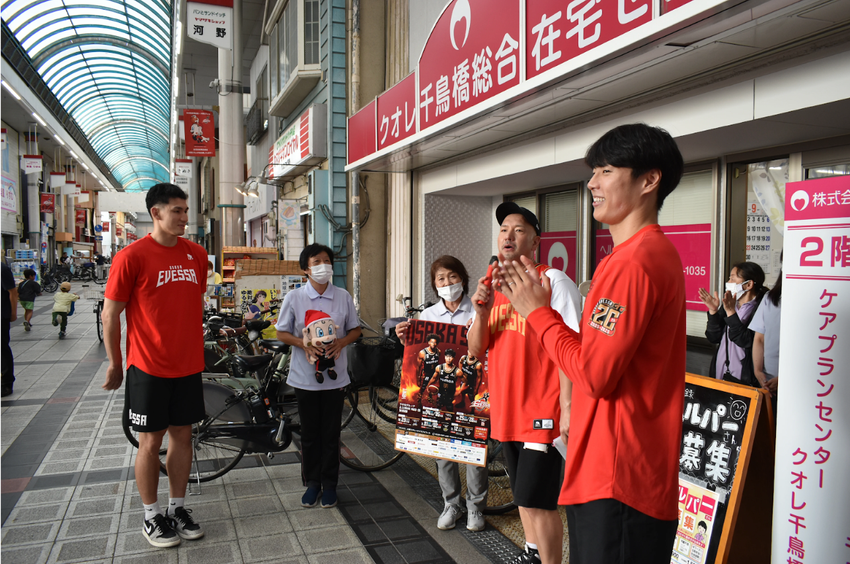 つなぐプロジェクト~地域×スポーツ×働く~リアルお仕事体験in商店街のオープニングイベントで商店街を訪問した植松義也選手(左)と牧隼利選手(右) ©OSAKA EVESSA