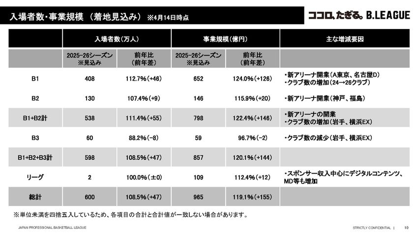4月14日、Bリーグはメディアブリーフィングを実施し、2025-26シーズンの入場者数および事業規模の着地見込みを発表した。事業規模が965億円に達し、当初の経営目標を大幅に前倒しして達成する見通しとなった。新アリーナの相次ぐ開業と「B.革新」を見据えた各クラブの先行投資が、リーグ全体の価値を押し上げている実態が浮き彫りとなった。
