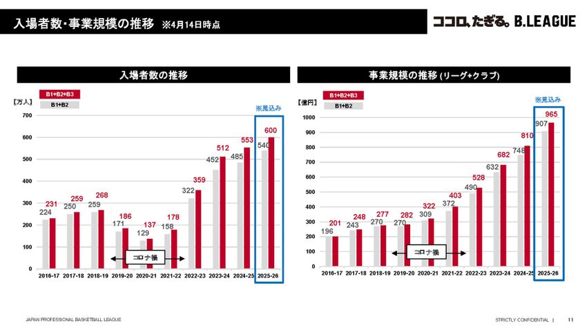 「リアルな数字をお見せできる状態になった」と切り出した島田チェアマンが示した資料によれば、今シーズンのB1・B2・B3、そしてリーグ興行を合わせた総入場者数は約600万人に到達。さらに事業規模は965億円にまで膨れ上がっている。Bリーグとしては2028年度目標として「総入場者数700万人、事業規模800億円」を挙げていたものの、後者はすでに160億円以上上回り、前者はあと100万人にまで迫る勢いだ。