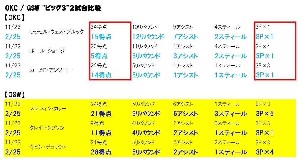 2月24日(日本時間25日)に行われたオクラホマシティ・サンダー対ゴールデンステイト・ウォリアーズ(@オラクル・アリーナ)戦は112-80で快勝。11月の前回対戦(11月23日、91-108)で敗れた“借り”を返した。 勝負どころで、ケビン・デュラントが爆発すると、控えのニック・ヤングが立て続けに得点し、一気に流れを引き寄せた。また、ウォリアーズらしい攻撃もさることながら、この試合で得点力の高いサンダーを80得点に抑えたディフェンスのすばらしさが光る。ラッセル・ウェストブルックとポール・ジョージ、カーメロ・アンソニーの3人に合計34得点(前回は76得点)しか与えなかったことも勝因の一つ。 これはウォリアーズの数字に大きな変化がなく、サンダーが著しく数字を落としていることからも分かるだろう(※別表参照)。 ウォリアーズはデュラントのほか、ステフィン・カリーが21得点、9リバウンド、ニック・ヤング(3Pシュート4本を含む)が16得点を記録。 クレイ・トンプソンは不発に終わっているが、それでもベテランが地道なプレーで貢献し、ベンチから出てきたプレーヤーが活力を与えた。 また、サンダーのビッグマンであるスティーブ・アダムズに対し、ザザ・パチュリアではなく、ジャベール・マギーが奮闘したことも大きい。両チームにテクニカル・ファウルが乱れ飛んだゲームだったが、明らかにサンダーは自分たちが思いどおりにいかないフラストレーションだったに違いない。 次の対戦は4月4日(同5日)にサンダーのホームで行われる。 (月刊バスケットボール)