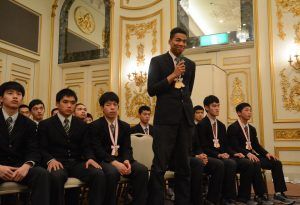2月25日、宮城県仙台市内で、明成高男子バスケットボール部のウインターカップ優勝を祝う祝勝会が行われた。全国から関係者が集い、2年ぶり5回目のウインターカップ制覇を盛大にお祝い。同校吹奏楽部の生演奏や、優勝までの軌跡をまとめたビデオの上映、3年生たちのインタビューなどが行われた。 3年生へのインタビューの中で、“兄・八村塁選手へ一言”という質問を受けた八村阿蓮選手は、「僕は小さい頃から兄の背中を見てやってきました。今回ウインターカップで優勝することができて、『少しは兄に近付けたかな』と思っています。将来は、兄と一緒に日本代表として、日の丸を背負ってコートに出たいです」と力強くコメント。