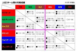 現在、NBAレギュラーシーズンは約3/4(82ゲーム中63~65ゲーム)を終えている。東西両カンファレンスは、それぞれ上位2チーム(トロント・ラプターズ、ボストン・セルティックス/ヒューストン・ロケッツ、ゴールデンステイト・ウォリアーズ)が勝利数では抜け出した。 逆に、3位以下はともに混戦となっている。ウェスタンではオースルター後に好調で、8連勝中のポートランド・トレイルブレイザーズが3位に食い込んできた。そこで、あくまで現時点ではあるが、各カンファレンスの上位3チームは、それぞれどのような対戦成績を残しているのかを見てみよう(表参照)。