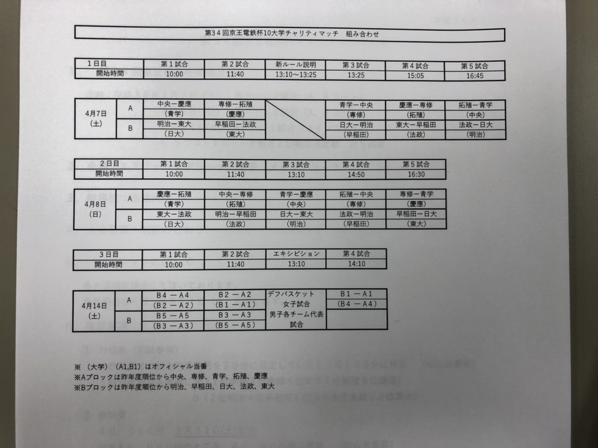 “第34回京王電鉄杯10大学チャリティマッチ”が4月7~14日、エスフォルタアリーナ八王子(東京)で開催される。   この大会は、関東大学男子10校(中央大、専修大、青山学院大、拓殖大、慶應義塾大、明治大、早稲田大、日本大、法政大、東京大)が集まって行われる。   また、最終日はエキジビションとして、デフバスケットボール(女子)なども予定。組み合わせ、およびスケジュールは以下のとおりとなっている。