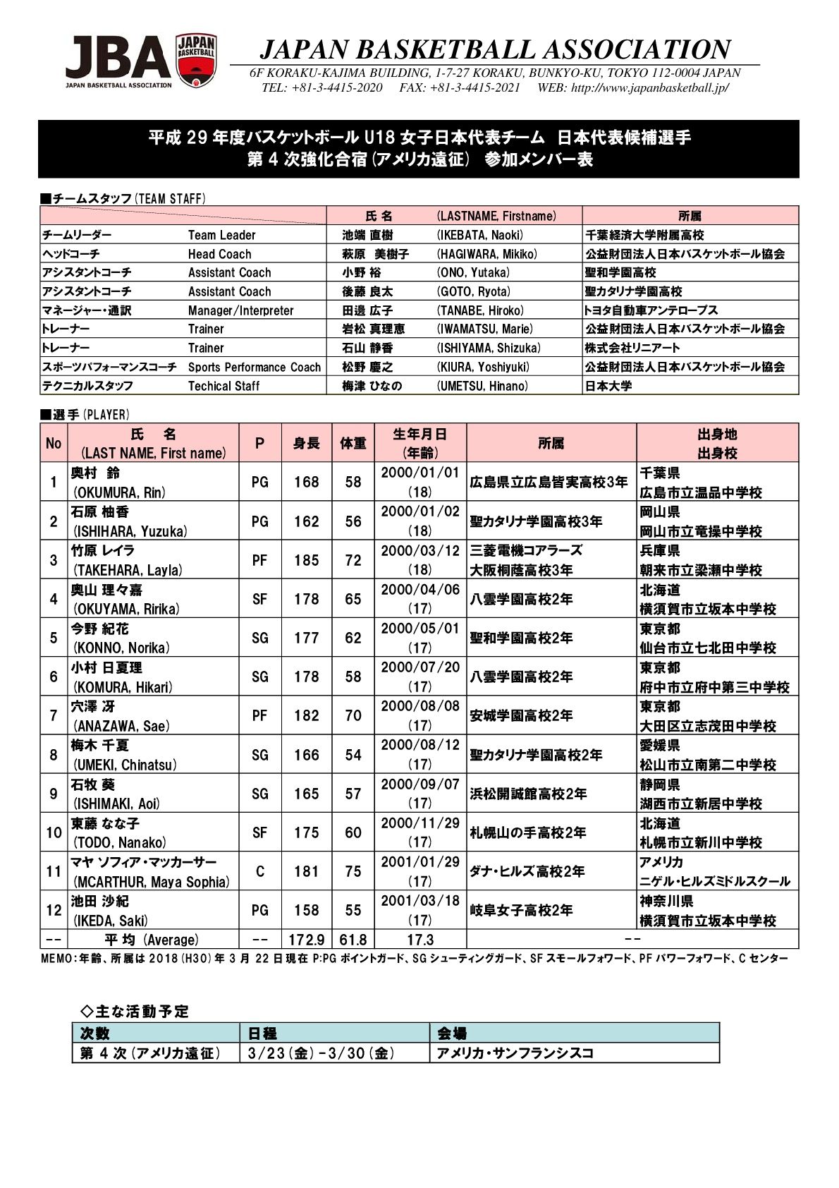 今年10月にインドで開催される“FIBA U18女子アジア選手権大会2018”へ向けて、平成29年度バスケットボール女子U18日本代表チームは、現在(3月24~30日)、アメリカ遠征中。 遠征に参加している日本代表候補選手は以下のとおり。 ★平成29年度バスケットボール女子U18日本代表チーム 日本代表候補選手 アメリカ遠征メンバー *選手 奥村 鈴(広島皆実高3年) 石原 柚香(聖カタリナ学園高3年) 竹原 レイラ(三菱電機/大阪桐蔭高3年) 奥山 理々嘉(八雲学園高2年) 今野 紀花(聖和学園高2年) 小村 日夏理(八雲学園高2年) 穴澤 冴(安城学園高2年) 梅木 千夏(聖カタリナ学園高2年) 石牧 葵(浜松開誠館高2年) 東藤 なな子(札幌山の手高2年) マヤ ソフィア・マッカーサー(ダナ・ヒルズ高2年) 池田 沙紀(岐阜女高2年) ※所属は3月22日現在 *強化活動 スケジュール <アメリカ遠征> 日程:3月24~30日 会場:アメリカ サンフランシスコ (月刊バスケットボール)