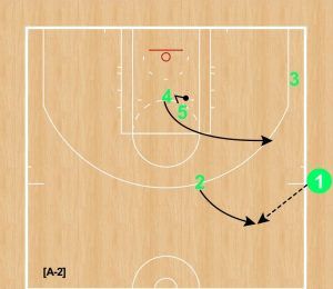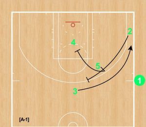 [A-1] トップに③、ペイントの中心に④、ボールサイド付近に⑤、右コーナーに②、インバウンダーが①というボックスセットの変形。ポジションにあまり固執せず、シュート力のあるプレーヤーを投入した。 ⑤がフェイクから④へダウンスクリーン、②は③へバックスクリーンを仕掛ける。