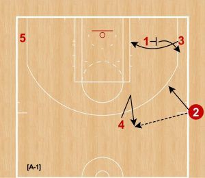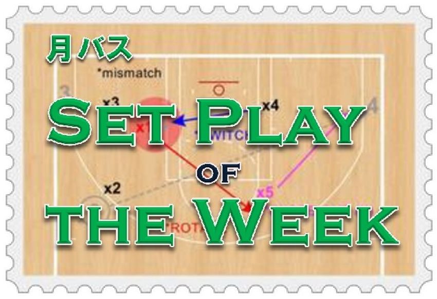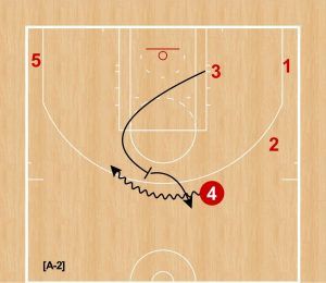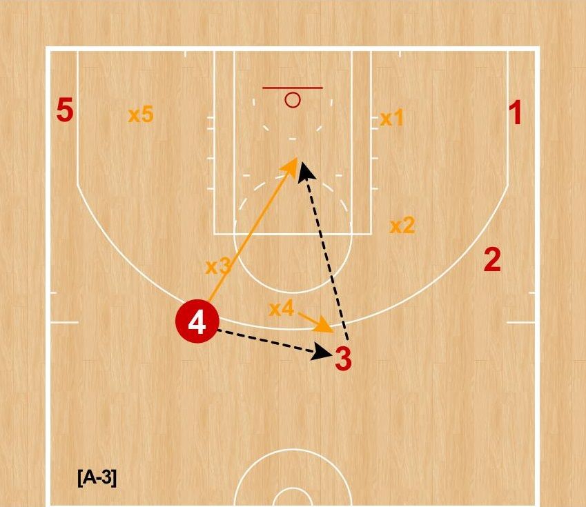 [A-3] ③は3Pシューターなので、X4は一時④へとディフェンスしようとしたが、慌てて③へ。その瞬間、④はX3を出し抜き、直線的にギブ&ゴー(バスケットカット)。③からのパスは入ってレイアップとなった。 ディフェンスの状況を見極めたレブロンと、シューターであるコーバーの見事なパスという抜群のコンビネーションだった。
