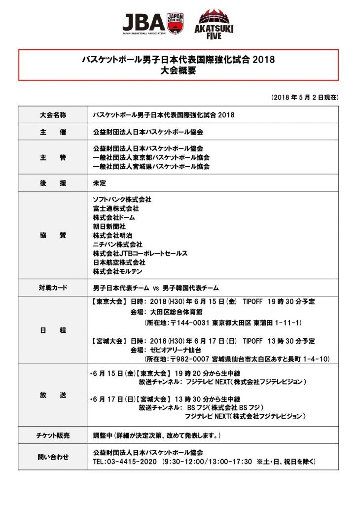 JBAは6月15、17日の2日間、東京・宮城の2会場で、“バスケットボール男子日本代表国際強化試合2018”を開催する。