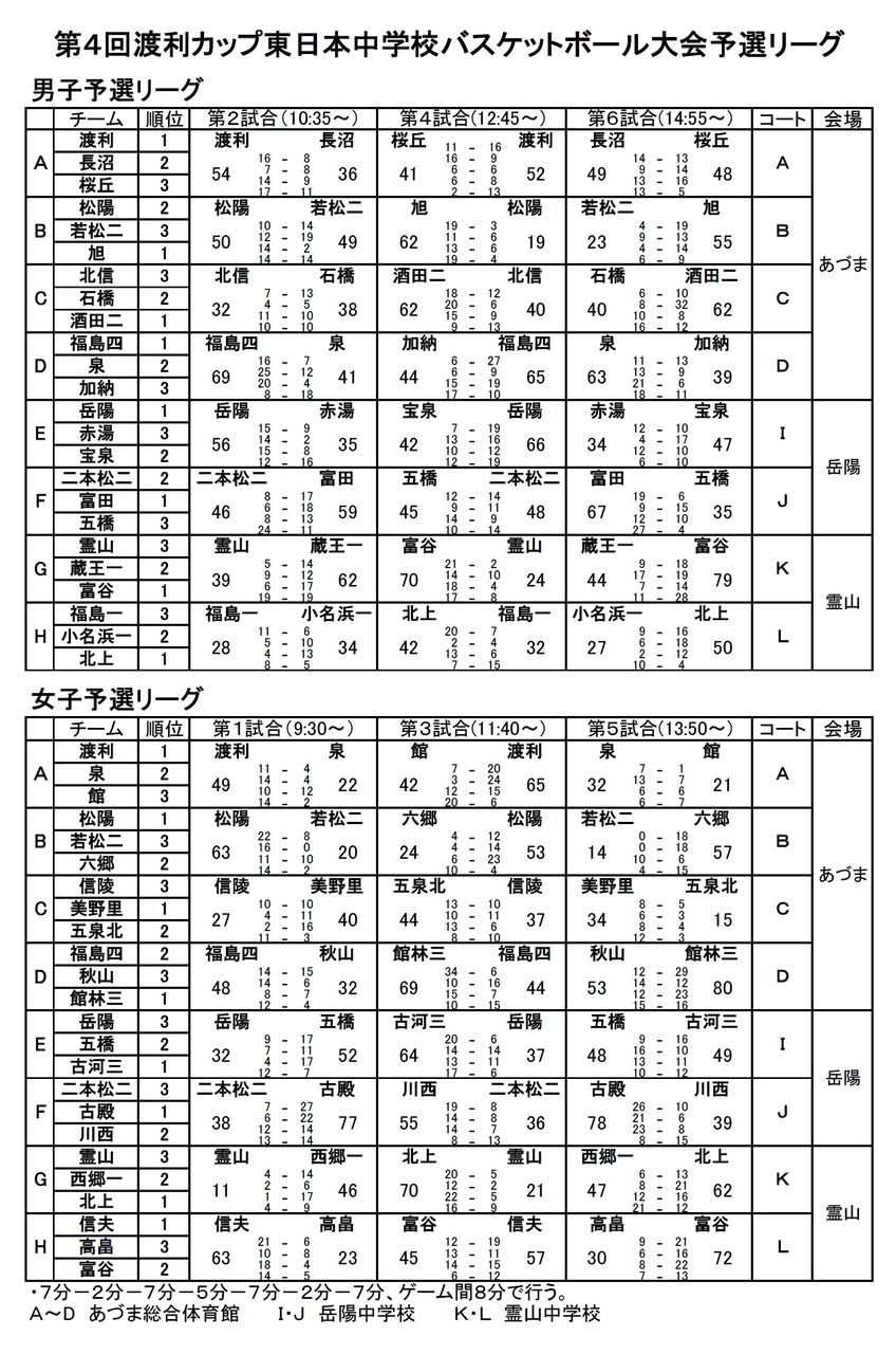 5月3~5日、あづま総合体育館(福島)ほかで“第4回渡利カップ東日本中学校バスケットボール大会”が開催された。試合結果は以下のとおり。   *予選リーグ