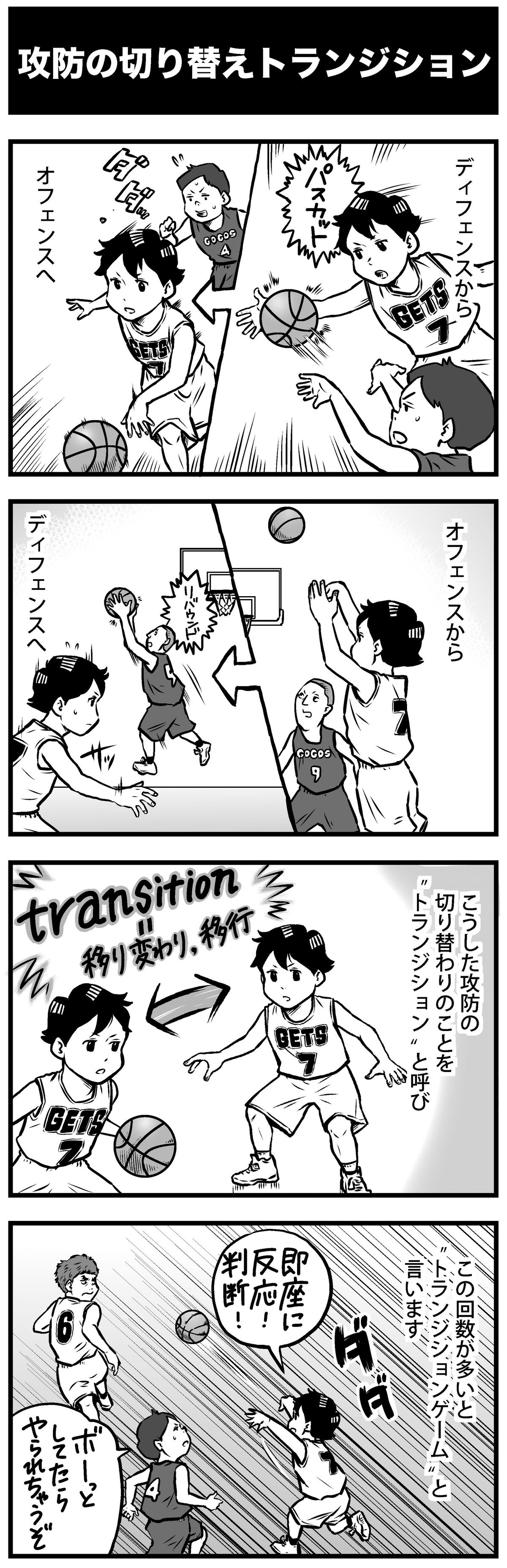 月刊バスケットボールで連載中の『まんが バスケットボール用語辞典』をウェブでも読めるように! 和製英語ではなく、正しい英語のニュアンスで理解していくと、より分かりやすくなる。今回は “トランジションゲーム”について。