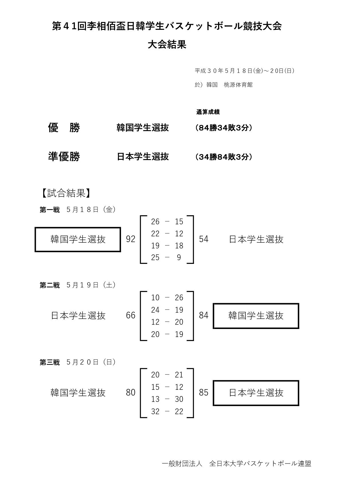 “第41回李相佰盃日韓学生バスケットボール競技大会”が5月18~20日に、韓国・桃源体育館で開催された。<続きを読む> “第41回李相佰盃日韓学生バスケットボール競技大会”が5月18~20日に、韓国・桃源体育館で開催された。 試合結果は以下のとおり。 〔男子〕 優勝…韓国学生選抜(通算84勝34敗3分) 準優勝…日本学生選抜(通算34勝84敗3分) 〔女子〕 優勝…日本女子学生選抜(52勝23敗3分) 準優勝…韓国女子学生選抜(23勝52敗3分) 結果① (月刊バスケットボール)