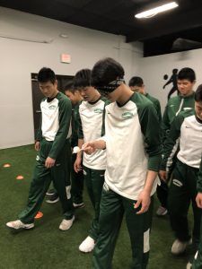 その後、ISWにてスポーツ心理学を学び、コミュニケーション、プレッシャー、チームワークを駆使してチームディベロップメントをしていくゲームを行いました。 そのゲームは、5人1組の代表が目隠しをしてスプーンの上にピンポン玉を乗せて持ちます。チームメイトが英語で声をかけながら誘導をしていきます。途中にある障害物を踏まずに15m先にある紙コップにピンポン玉を入れるというゲームです。 途中で落としたり、障害物を踏んでしまったりした場合は、スタート地点からやり直しです。とても盛り上がりました。