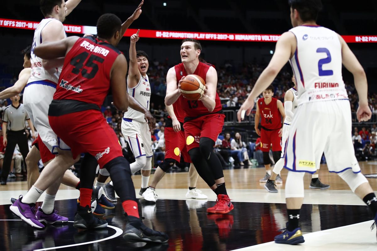 Bリーグ2017-18シーズン最後の試合となったB1・B2入替戦。残留プレーオフで大激戦の末、横浜に惜しくも敗退した富山グラウジーズ(B1)と試合を重ねるごとに進化を遂げている熊本ヴォルターズ(B2)の一戦は、最後の1秒まで目が離せない大接戦となった。 富山はB1残留 試合は、富山♯9水戸のスティールから#34ウィラードのレイアップが先制点となると、対する熊本は#1中西、#8ドゥインカーがリング下で着実に得点を重ね、20‐23で熊本が3点リードで1Qを終える。しかし2Q開始直後には、富山#13チャップマンの連続得点で逆転に成功。すると#24大塚も3Pシュートを連続で決め、チームが勢いに乗り出す。一方の熊本も#14ヴァンデンバーグがオフェンスリバウンドからのバスケットカウントで対抗。42‐38の富山4点リードで前半を折り返した。 迎えた後半、富山が#15青木や#81小原がファウルアウトに追い込まれ危機的状況に対面すると、熊本は中西がフリースローを決めじわじわと点差を広げにかかる。それでも富山は#11宇都がトリプルダブル級の活躍を見せ、両者一歩も譲らない展開に。シーソーゲームが続く中、試合時間残り34秒で富山ウィラードの3Pライン付近から放ったシュートが決まり勝負あり。と思われたが、残り6.3秒に熊本#30ウッドベリーが3Pシュートをリングへ沈め、1点差まで詰め寄る。 しかし、最後は宇都がファウルゲームのフリースローを2本とも決めて試合終了。富山が心身ともにタフな試合を制し、B1残留を決めた。熊本・保田HCが「最後の最後までチャンスはあった」と言うように、最後のブザーが鳴るまでどちらへ転ぶか分からない、見ごたえのある試合だった。