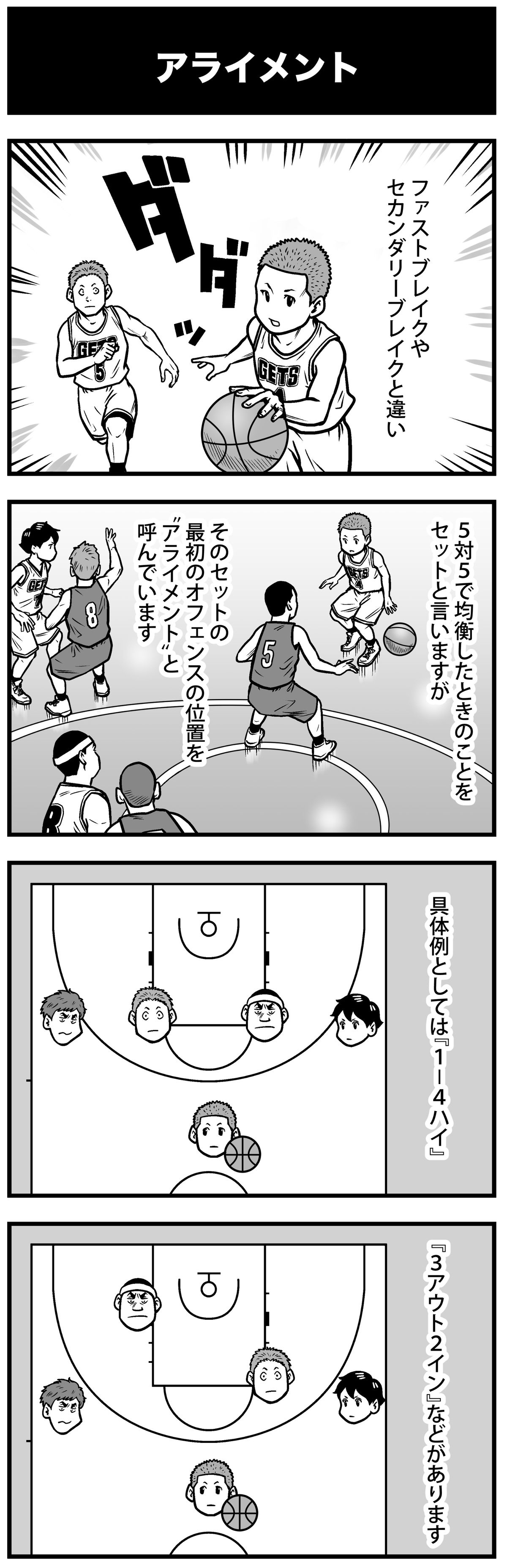 月刊バスケットボールで連載中の『まんが バスケットボール用語辞典』をウェブでも読めるように! 和製英語や造語ではなく、正しい英語のニュアンスで理解していくと、より分かりやすくなる。今回は “アライメント”について。